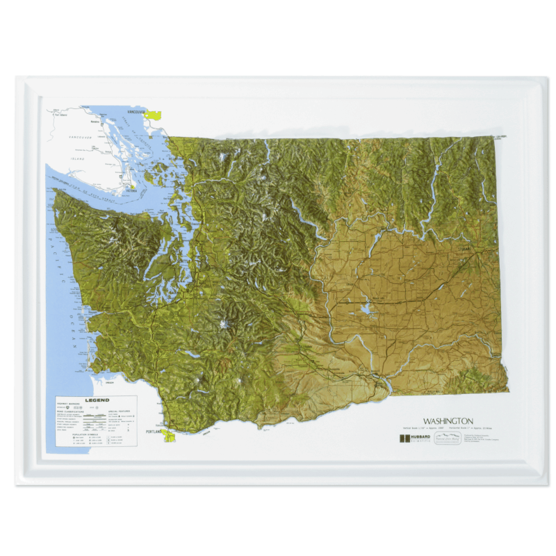 3D raised relief map of Washington with unframed dimensions of 22” x 17” This map is printed on 2mm thick high-grade rigid vinyl, then one of our technical artists heat-treats and vacuum-forms each individual print over our custom Washington mold. Showcase the home of the Space Needle with a one-of-a-kind and fun to touch 3D raised relief map. It’s wall art, it’s a sculpture, and it’s a functional map!
