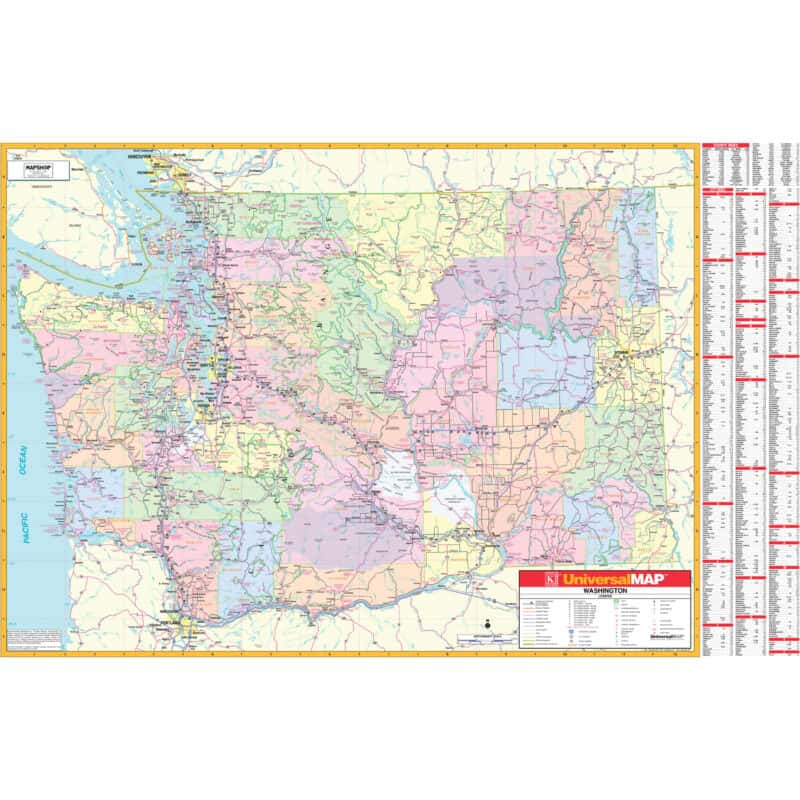 The Washington State Wall Map by Kappa Map Group is a comprehensive and detailed representation of the state. It includes indexes of cities and counties directly on the face of the map for easy reference. The map encompasses a wide range of details, including all state highways, all federal highways, secondary roads, cities and towns, major airports, major waterways, state universities, military installations, county populations, state and national parks, ski areas, and points of interest.