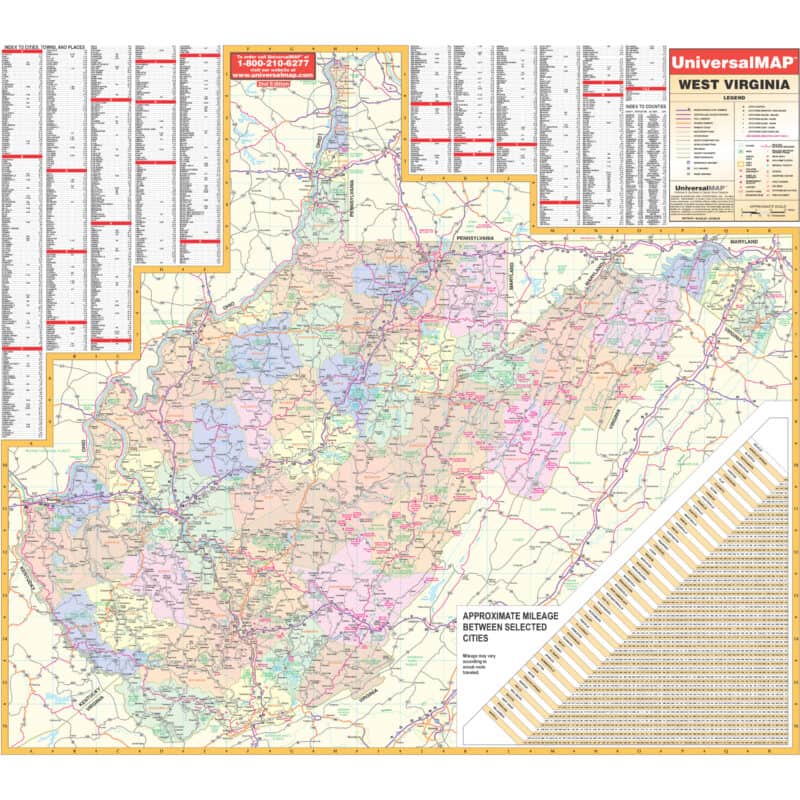 The West Virginia State Wall Map by Kappa Map Group is a comprehensive cartographic tool, providing an in-depth view of the state. This map includes cities and counties indexed on its face for easy navigation. It features color-coded counties and a handy mileage chart to calculate distances between major cities. Detailing all state and federal highways, major waterways, state universities, military installations, major airports, state parks, and wildlife areas, it covers a wide range of geographical and infrastructural elements. Additionally, the map presents cities, towns, and various points of interest across West Virginia, making it a valuable resource for residents, professionals, and visitors seeking detailed geographic information.