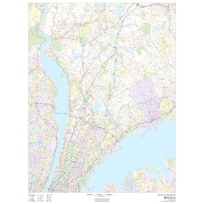 This map of Westchester County, New York shows regional level information. Base map features include highways and major roads with labelling; neighborhood names; railways; high level land use such as parks and recreation areas, industrial areas and hospital campuses; and a selection of points of interest including transportation hubs like airports and train stations, tourist information, police stations and shopping centres. zip code boundaries are shown as a secondary map feature.