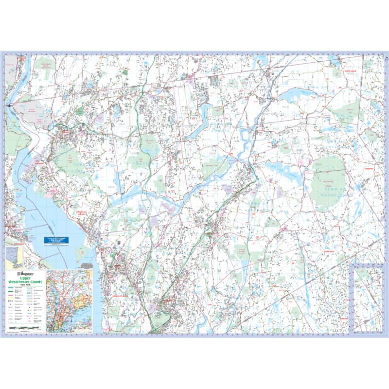 The Upper Westchester County, NY Wall Map also includes an area map of Westchester County. Details and features on the map encompass block numbers, cemeteries, golf and country clubs, hospitals, longitude and latitude coordinates, neighborhoods, points of interest, police stations, post offices, railroads, recreational parks, schools, streets and highways, and ZIP code boundaries.