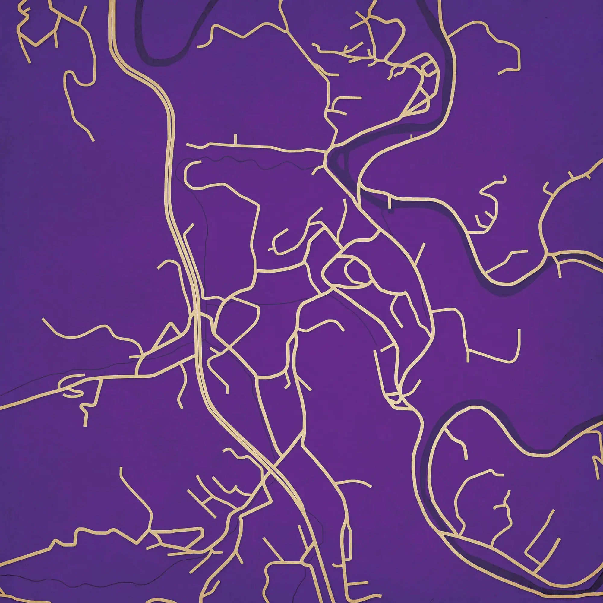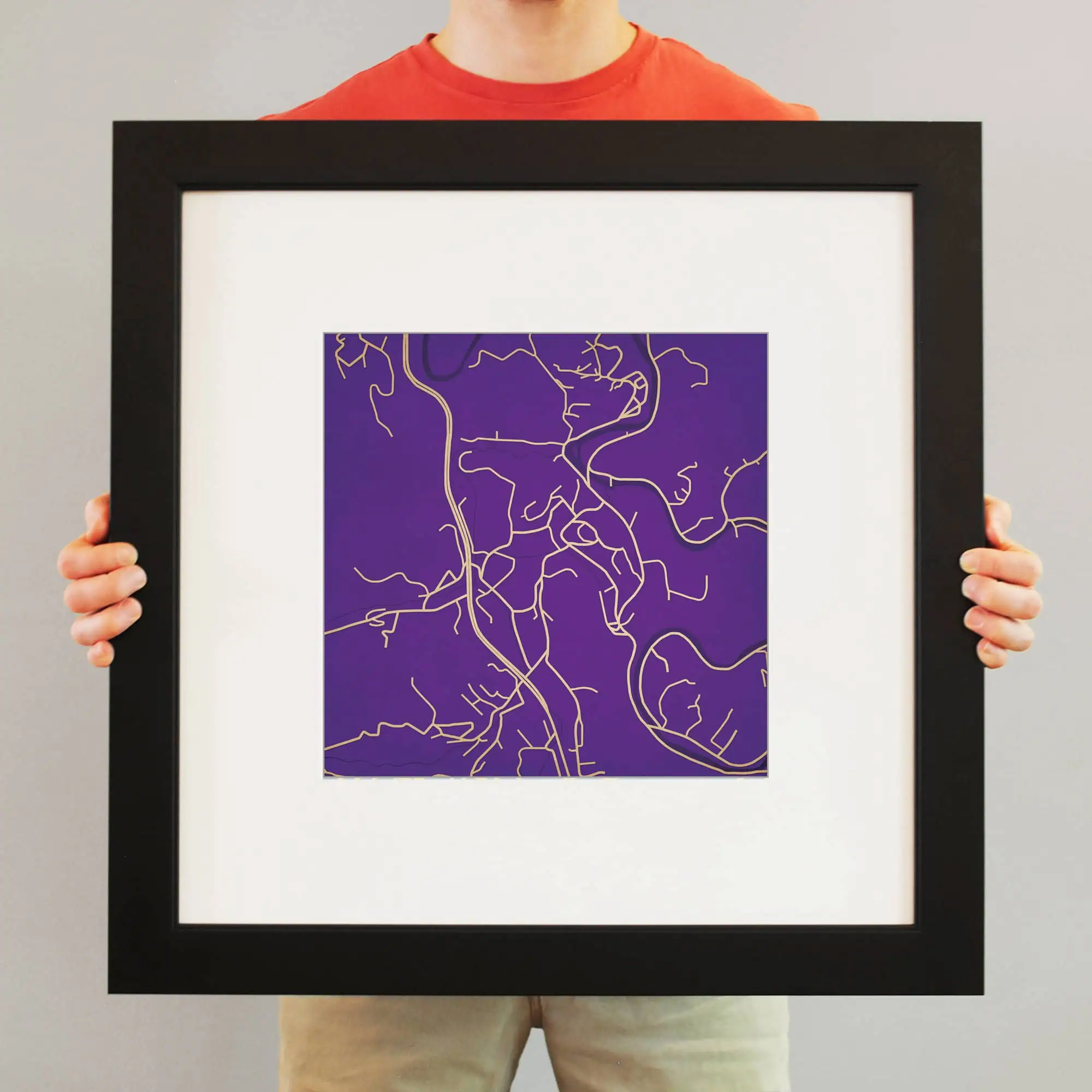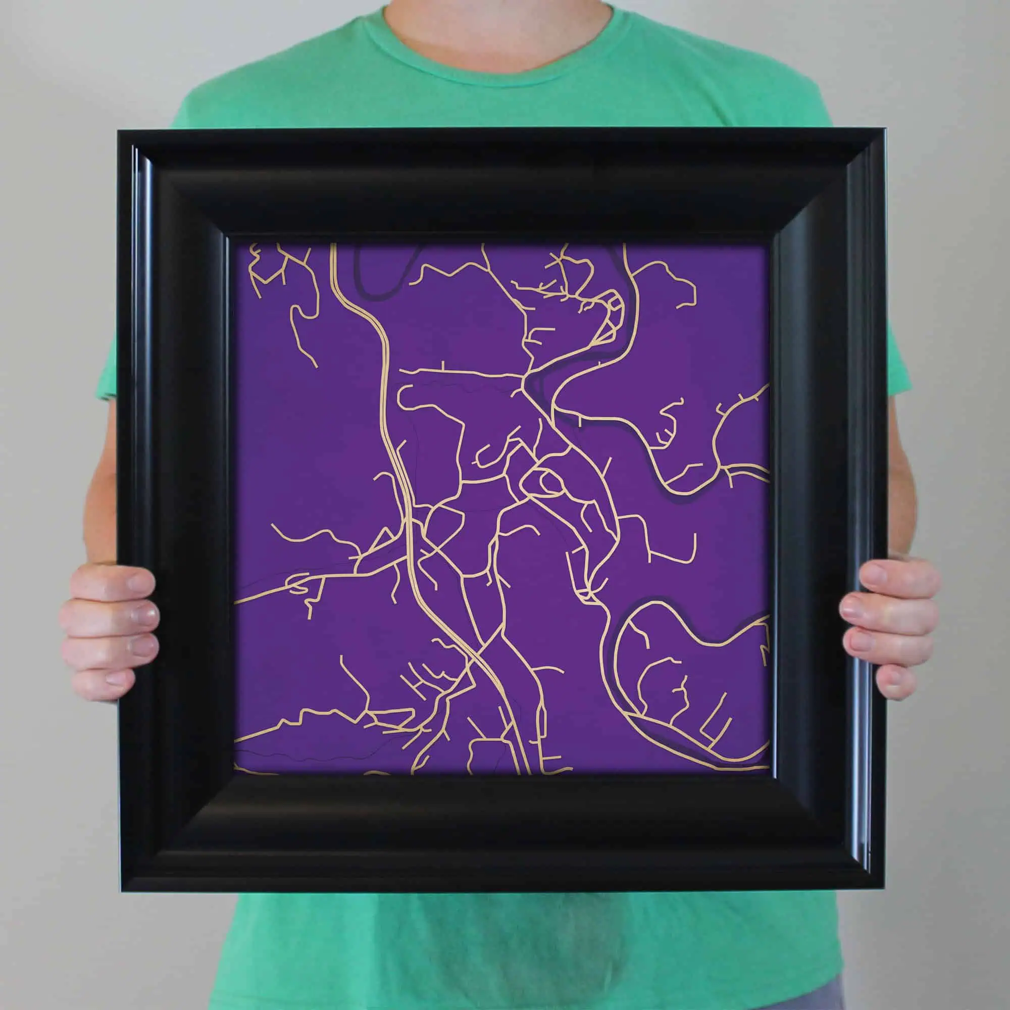 Colorful city map wall art featuring prominent street layouts and urban design, perfect for home or office decor, highlighting city navigation and geographic features.