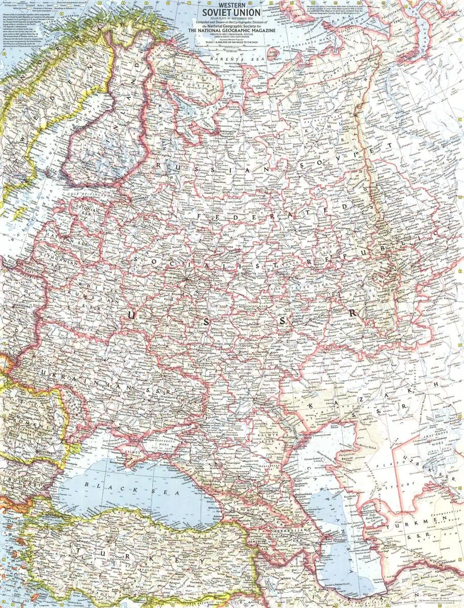 This Cold War era map shows the Western Soviet Union. Three years prior, Soviet military force was used to suppress uprisings in Poland and Hungary. This era also saw the Soviets launch the first artificial satellite into orbit, beginning the space race with the United States. Published in September 1959 with two articles on the region.