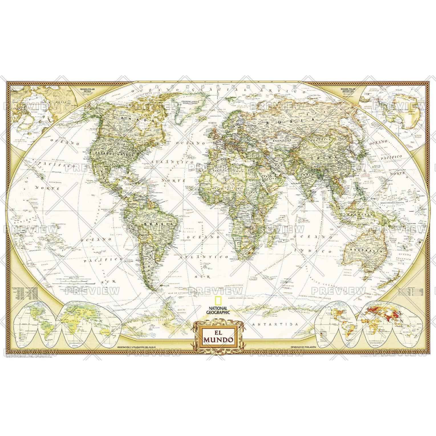 National Geographic’s Executive style World Map translated to Spanish features the Winkel Tripel projection to reduce distortion of land masses as they near the poles. This creates the most visually accurate representation of Earth’s land-masses, versus other projections. The Classic series includes blue oceans, easy-to-read colorful boundaries, and National Geographic’s proprietary fonts. Up-to-date and very detailed, with thousands of named places such as countries, oceans, major cities, geographic features. Antique executive styling. Prevailing winds and ocean currents at sea. Separate insets show the North and South Polar Regions, world vegetation and land use, and world population density.Â