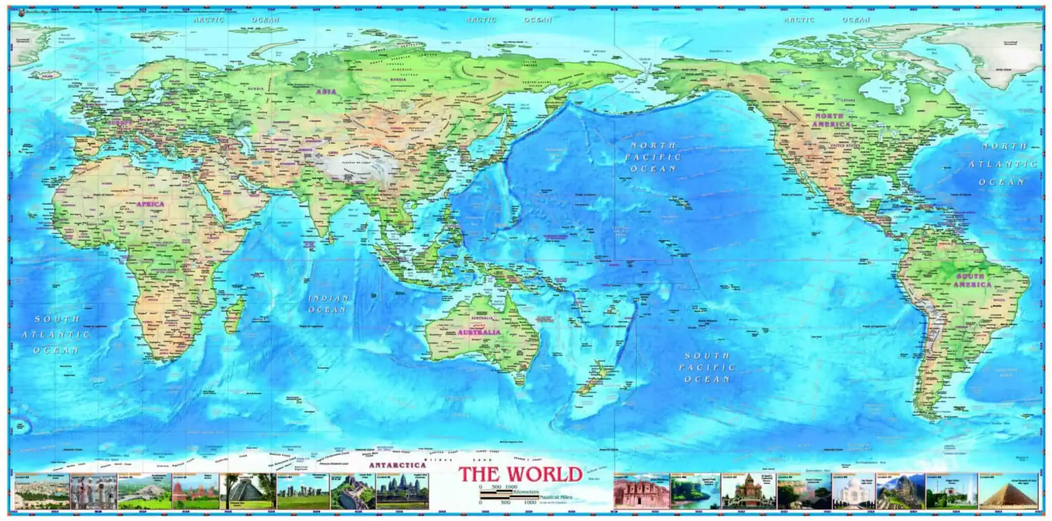 This World Wall Map Pacific centered features: « Cities « Physical/Terrain « International Borders « Physical Terrain names « National Borders « Latitude/Longitude Lines « Points of Interest « International Capitals « Ocean Relief « Wonders of the World