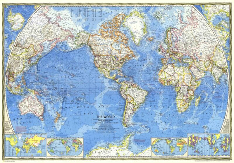 A great map is as much a reflection of its time in history as its beautiful craftsmanship. This map presents the world in classic National Geographic style: stunning colors, detailed geographical information, and timely insets. Published in 1970.