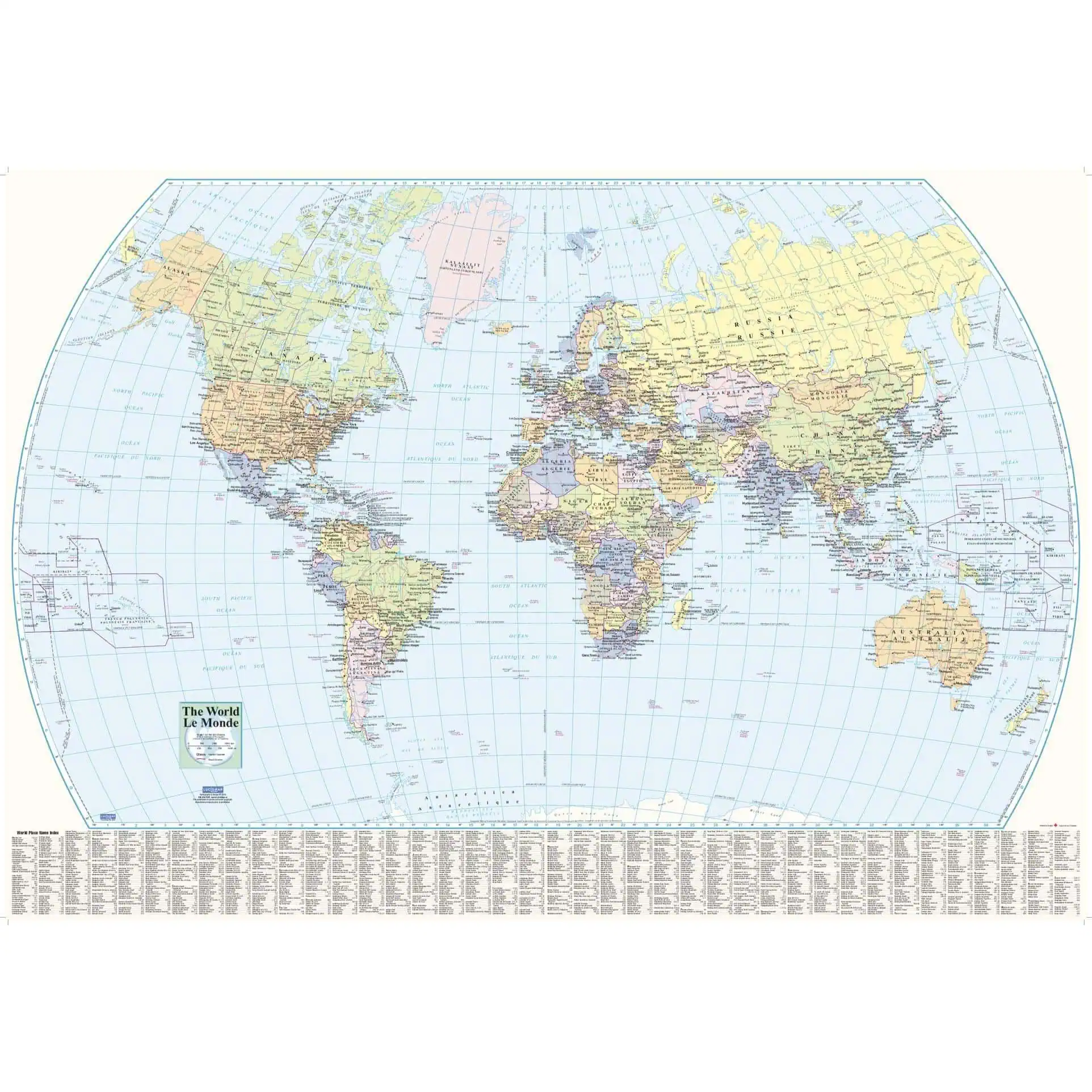This world wall map has been designed with all text in both French and English, making this an ideal product in Canada for schools, businesses and public areas. This political map, with a useful place name index, is ideal for classrooms and other public areas.