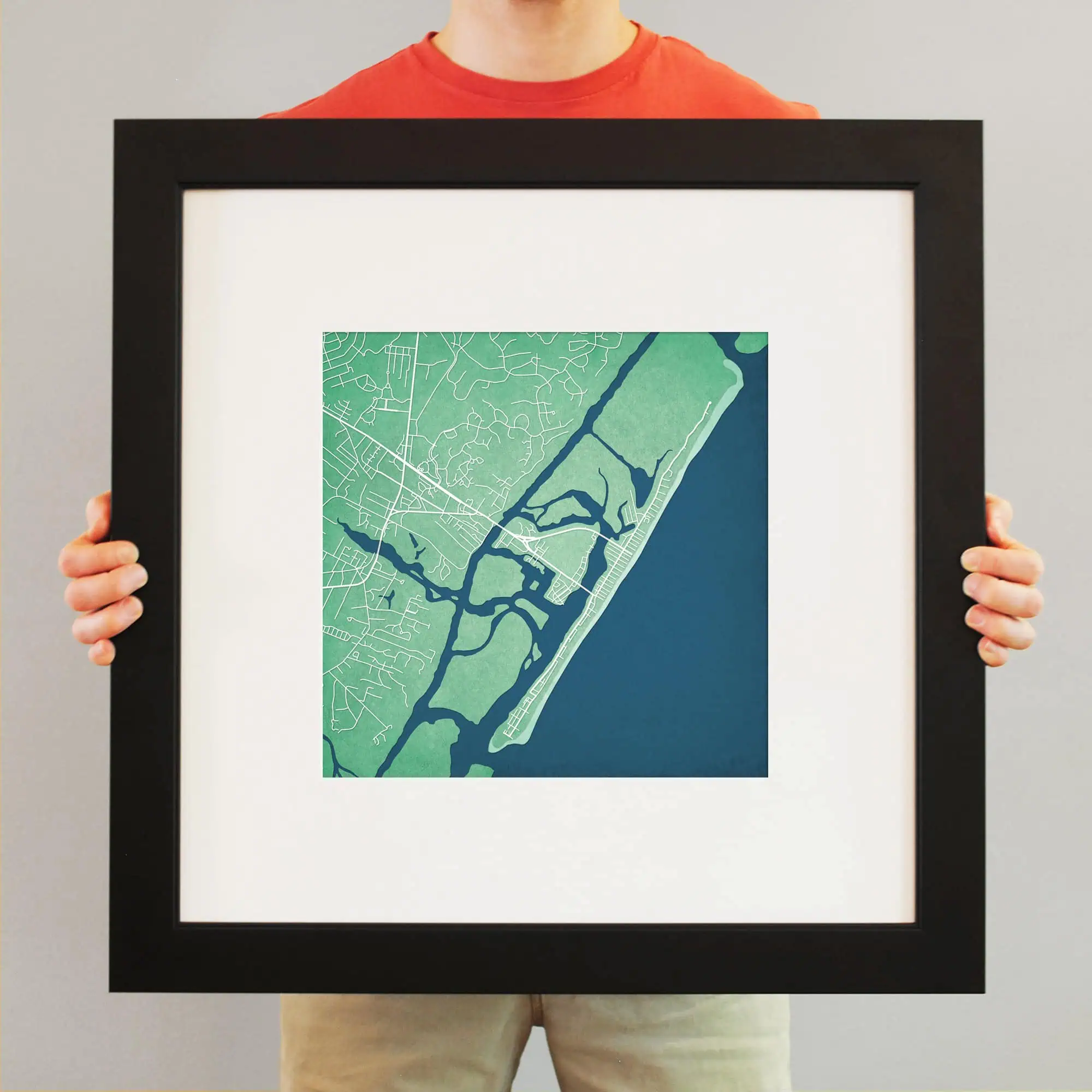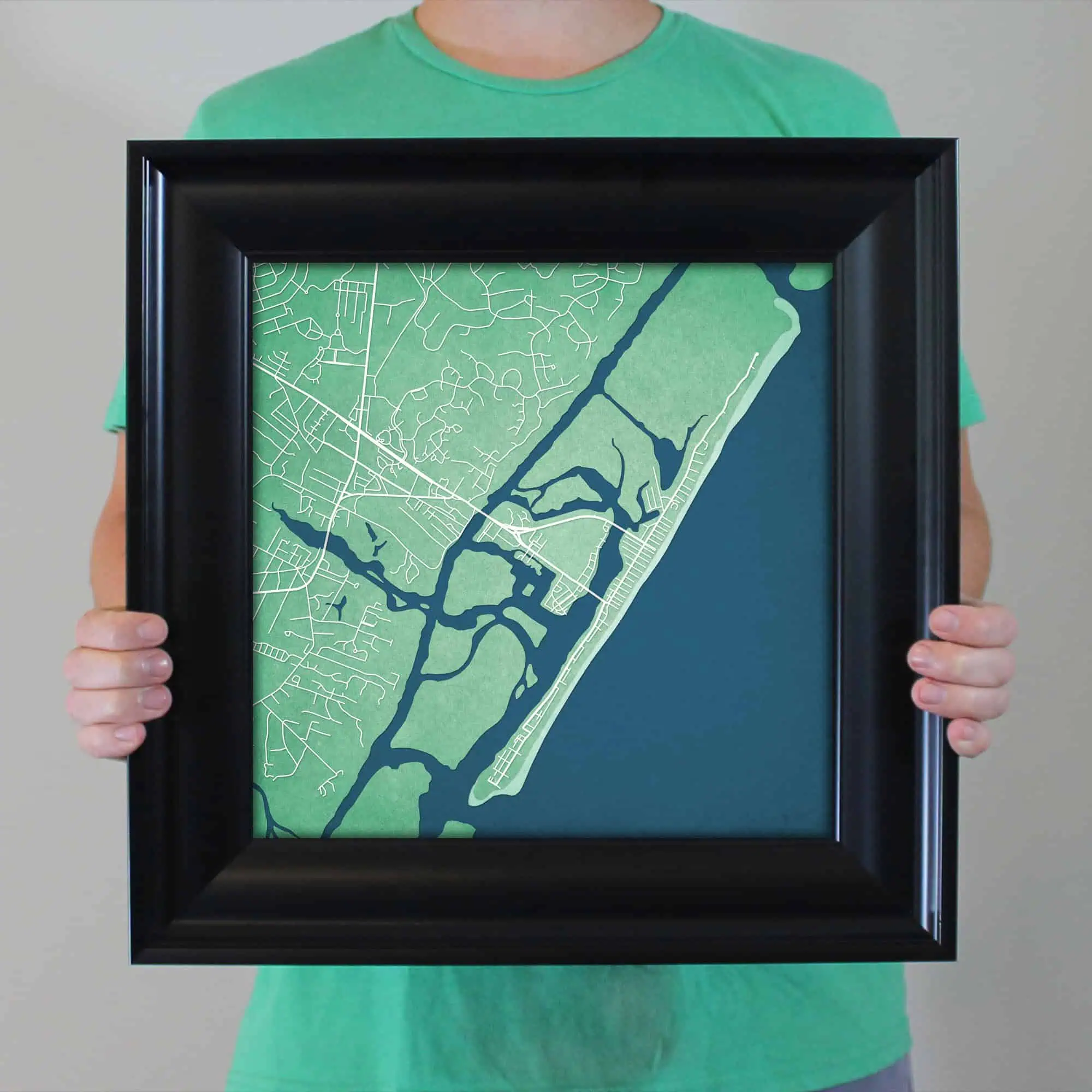 The size of this frame will vary depending on the size of the map you created. Frames are 16.5″ x 16.5″ for 12″ x 12″ prints and frames are 16.5″ x 20.5″ for 12″ x 16″ maps. Our frames have a black 2.75” wide heavy polystyrene molding. We choose to mount the prints without a glass/acrylic overlay, which shows off the unique properties of our paper stock when it hits the light. The back of the frame is sealed with a dust cover for added protection. Industrial silver hanging hardware is fixed to the back of the frame so it’s ready to hang on your wall.